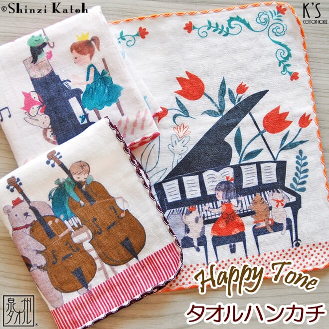 シンジカトウが描く、ヴィンテージ風のタッチで描かれた、子供たちや動物たちの演奏会♪ タオルハンカチの小さな世界に、素敵なメロディーが広がります。
